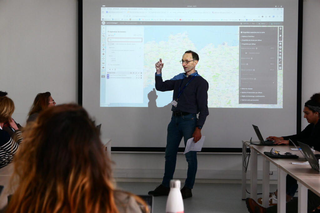 Antoine Riche a détaillé l’usage d’uMap, l’outil de référence pour créer ses cartes interactives. Comment y charger des données, géocoder des objets, changer les styles et le fond de carte, le tout en quelques clics. Un outil qui a fait ses preuves, avec un serveur hébergé par l’ANCT pour les agents de collectivités publiques.